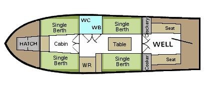 With accommodation for 4, the Japonica is ideal for mixed parties. There are 4 single berths, two burner cooker with grill and oven and a separate toilet with wash basin. The Japonica range of yachts have a full length awning, traditional gaff rig and a 10hp Nanni inboard diesel engine. Bed linen (sleeping bags) and crockery provided. The Japonica has a 12v battery supply only for lighting.