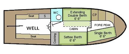 Length 27ft (8.23m). Beam 8ft (2.44m). Headroom 5ft 8in (1.77m) with cabin roof raised.